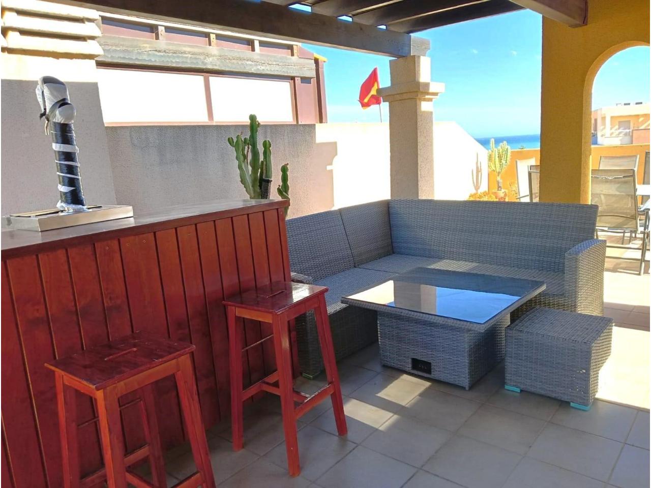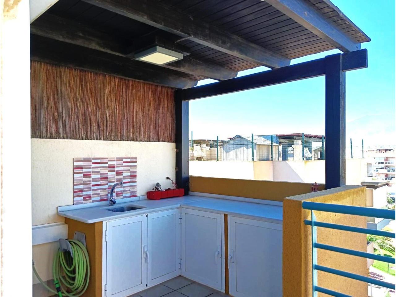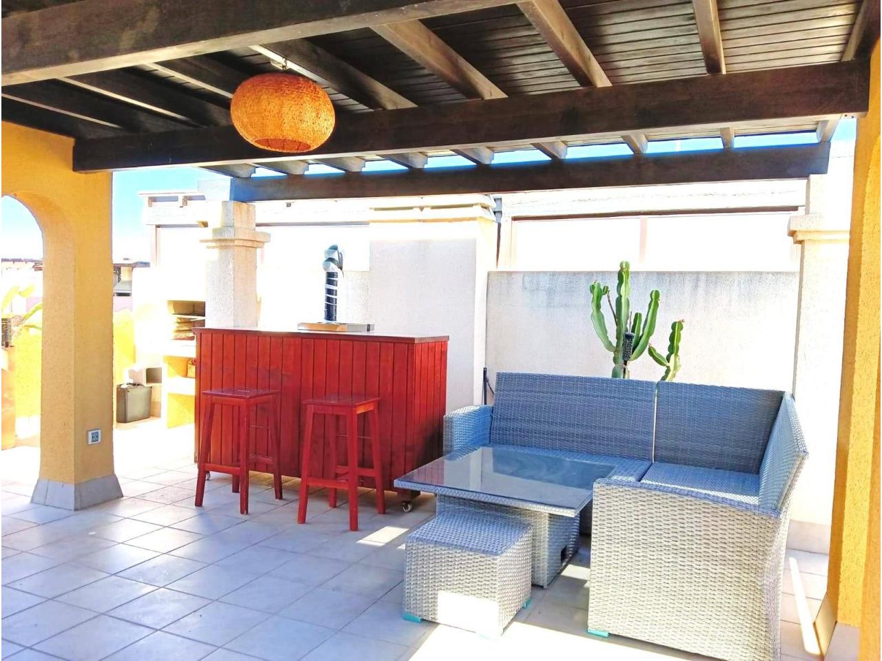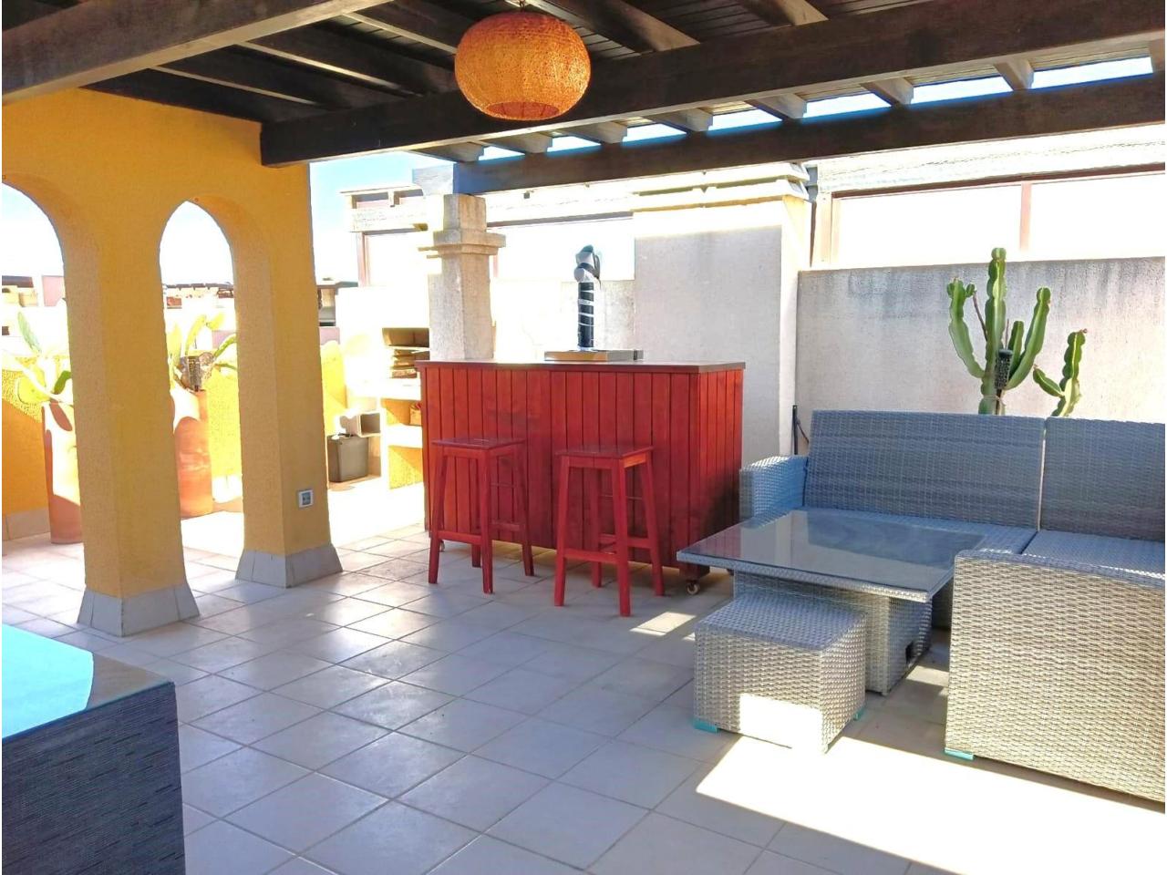 Desde la terraza principal, una escalera da acceso a un amplio solárium totalmente equipado con zona de barbacoa, barra, pérgola y mobiliario, ideal para relajarte o compartir momentos con familia y amigos.
