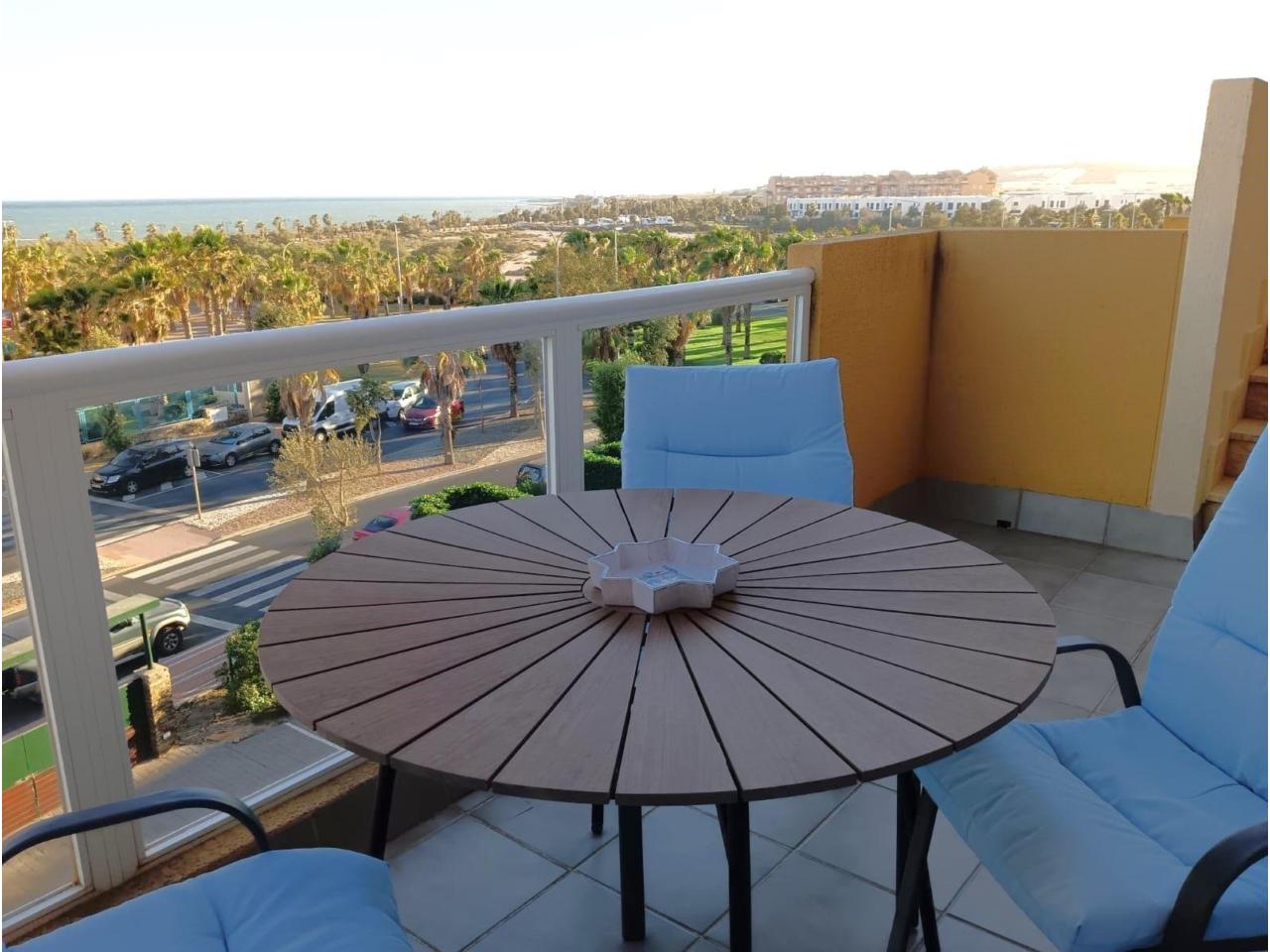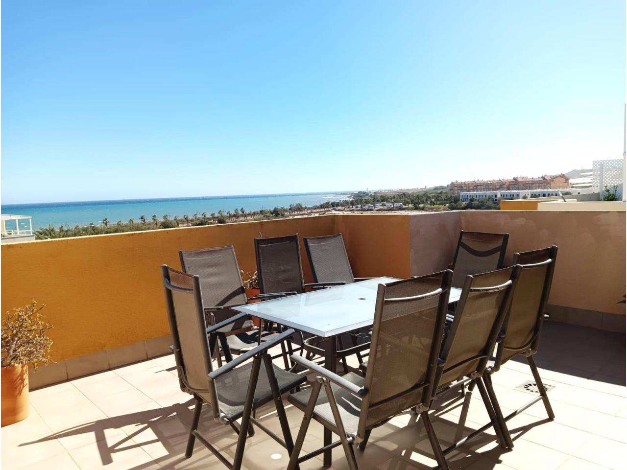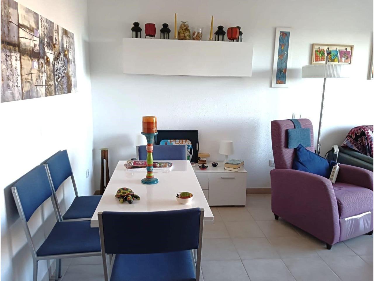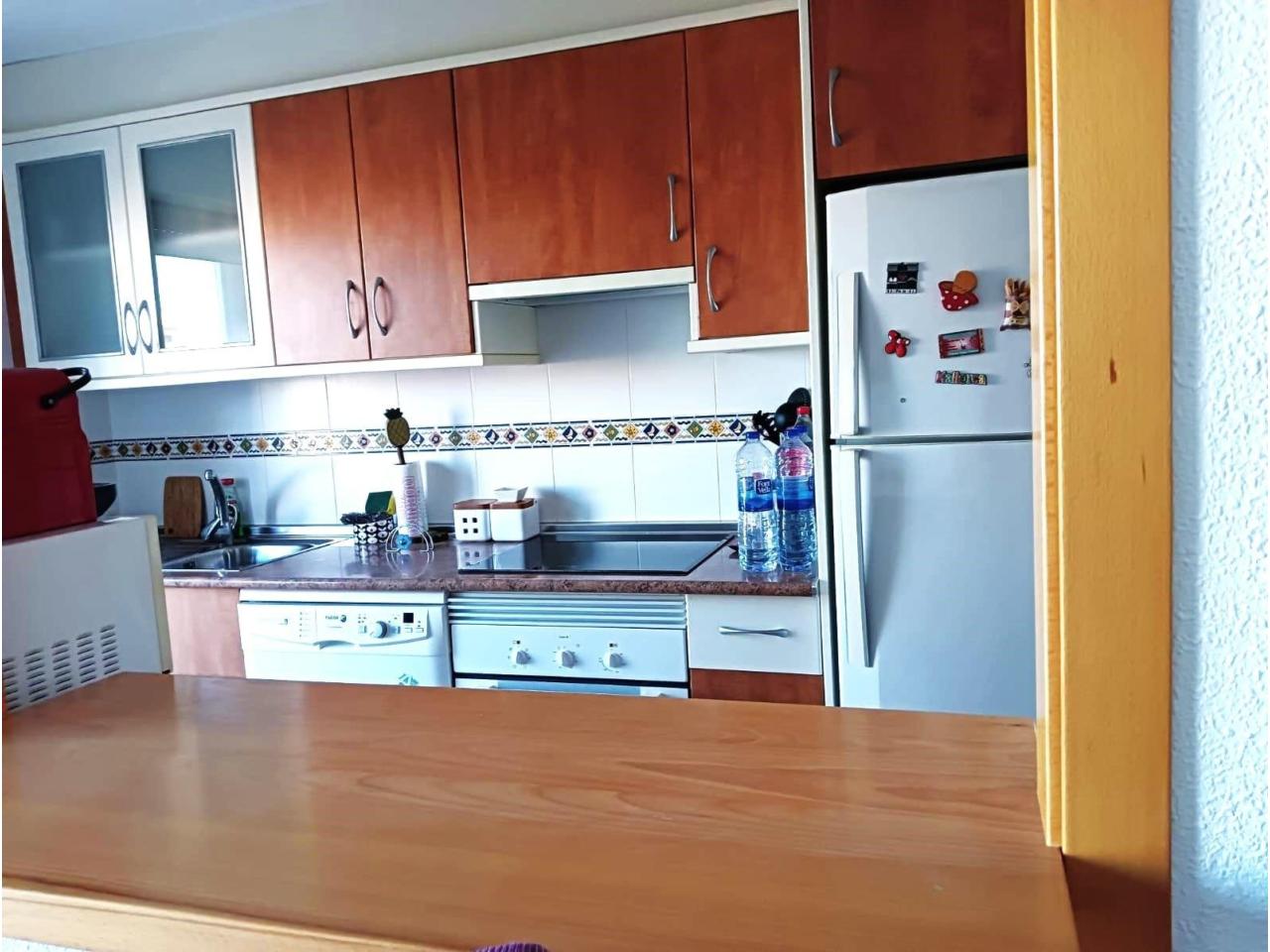 Cuenta con dos dormitorios con armarios empotrados, dos baños (uno en suite), y un luminoso salón-comedor con cocina tipo office y salida directa a una terraza con vistas al mar.