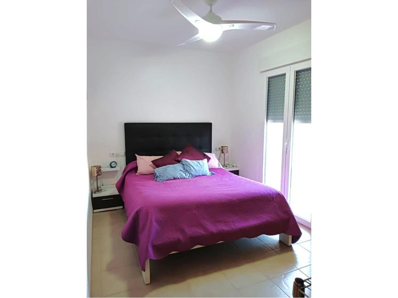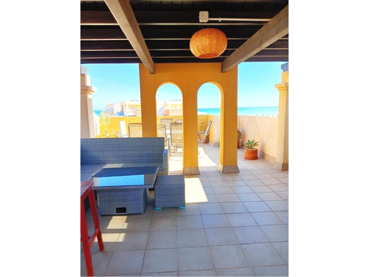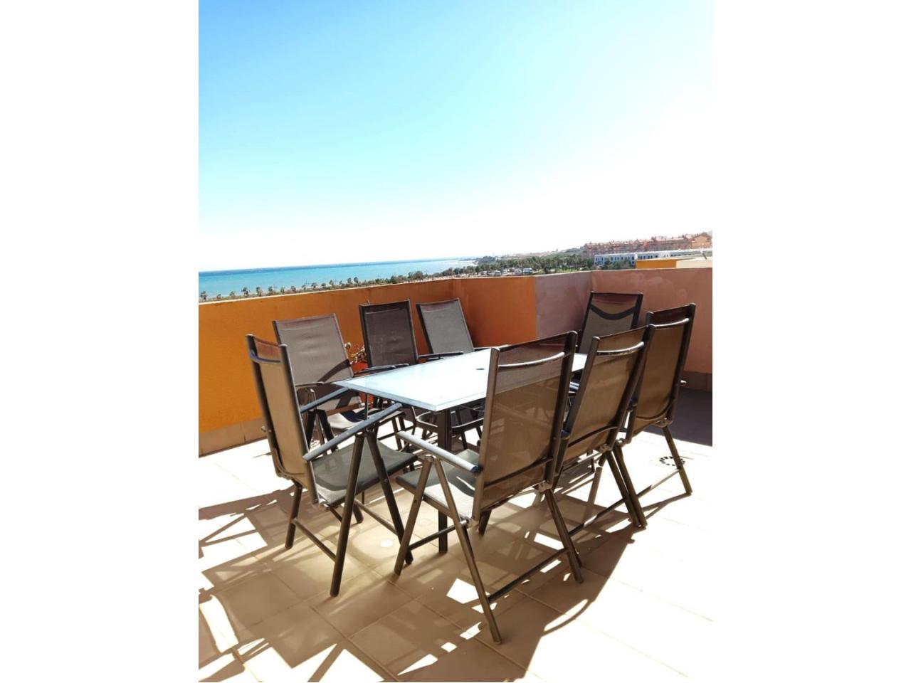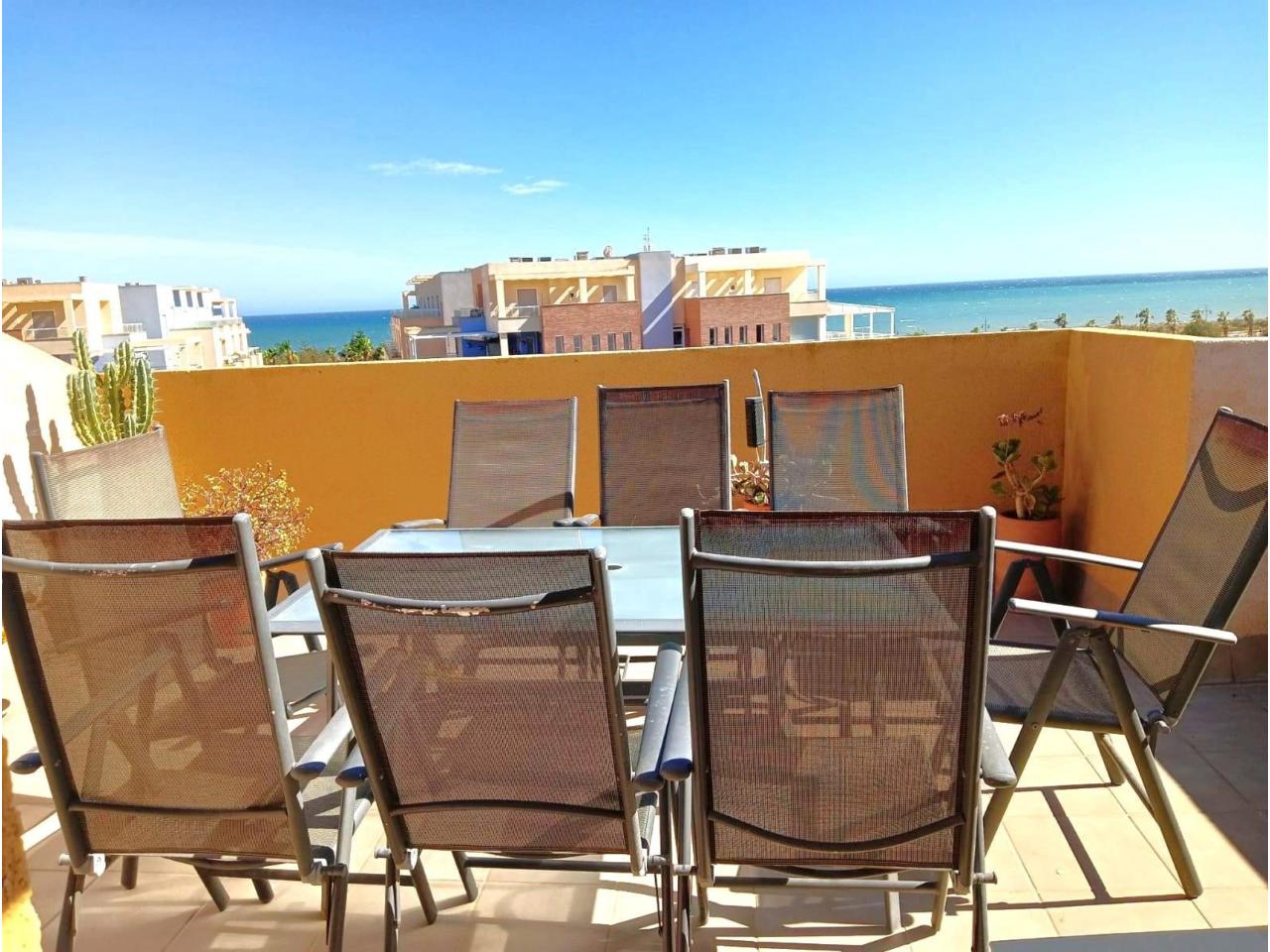 Cuenta con dos dormitorios con armarios empotrados, dos baños (uno en suite), y un luminoso salón-comedor con cocina tipo office y salida directa a una terraza con vistas al mar.